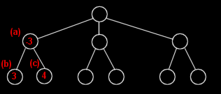 In figure 1, the value of -3 at node a is based on the values at nodes b and c. The moves that result in the positions at nodes b and c are valued at -3 and -4 respectively (the negated values of the positions that result from them). Node a is given the value of the best available move from that position (the move that results in the position of node b). Figure 2 shows the procedure applied throughout a game tree of depth 3.