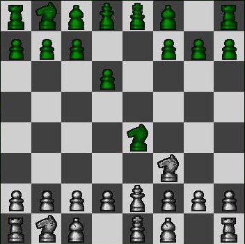 Figure 5. Petroff Defense - Classical Variation. Position after 5. D1-E2. This position occurred in the games Spassky-Kasparav, Linares 1981 and Turin 1982, (Kasparov & Keene (1989))